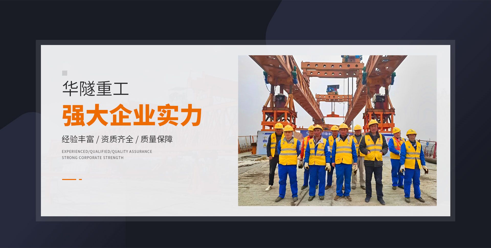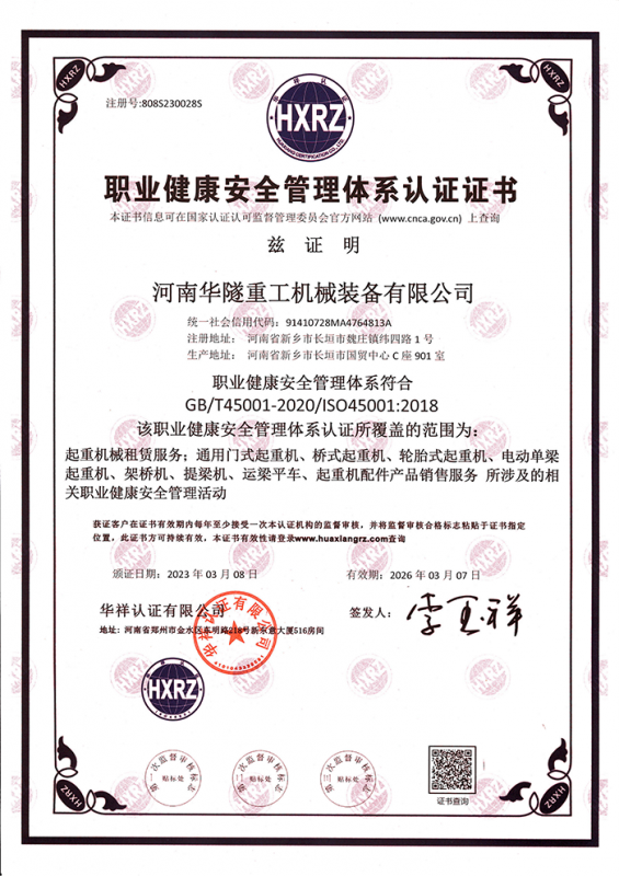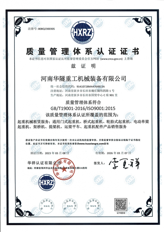 河南華隧重工機(jī)械裝備有限公司主要從事通用門式起重機(jī)、橋式起重機(jī)、電動(dòng)單梁起重機(jī),輪胎式起重機(jī)、架橋機(jī)、提梁機(jī)、遠(yuǎn)梁平車、鋼絲繩電動(dòng)萌蘆、卷揚(yáng)機(jī)、起重配件制造、銷售:起重機(jī)械租賃、安裝和維修,起重設(shè)備園收,機(jī)械設(shè)備維修,鋼結(jié)構(gòu)工程承包,橋梁工程及技術(shù)咨淘服務(wù),銷售五金制品、機(jī)電設(shè)備:建設(shè)工程監(jiān)理,建設(shè)工程設(shè)計(jì),各類工程建設(shè)活動(dòng),建筑勞務(wù)分包,建筑物折除作業(yè),施工作業(yè),工程管理服務(wù),土石方工程施工,裝如發(fā)運(yùn)。  公司已通過IS0國(guó)際質(zhì)量、環(huán)境、健康與安全三合一標(biāo)準(zhǔn)認(rèn)證,特種設(shè)備制造許可證和特種設(shè)備安裝改造維修許可證。擁有完熟的質(zhì)量管理體系。嚴(yán)格的管理制度,強(qiáng)大的生產(chǎn)能力和先進(jìn)的檢測(cè)手段,在保證產(chǎn)品質(zhì)量的同時(shí),也具備了極強(qiáng)的市場(chǎng)競(jìng)爭(zhēng)力。  公司堅(jiān)持科技創(chuàng)新為理念,產(chǎn)品質(zhì)量為核心,注重信譽(yù),建立了減信可靠、快捷、思速。便利周到的售后服務(wù)網(wǎng)絡(luò)。  我們擁有的技術(shù)專家和技術(shù)服務(wù)隊(duì)伍為客戶提供充善的售前技術(shù)支持和全天候的售后服務(wù)體系,讓您無后顧之憂,享受一站式的超值服務(wù)。  “華隧重工,伴您成功“是華隧重工永遠(yuǎn)的宗指,真被的希望與各界朋友攜手并進(jìn)。共創(chuàng)輝準(zhǔn)!